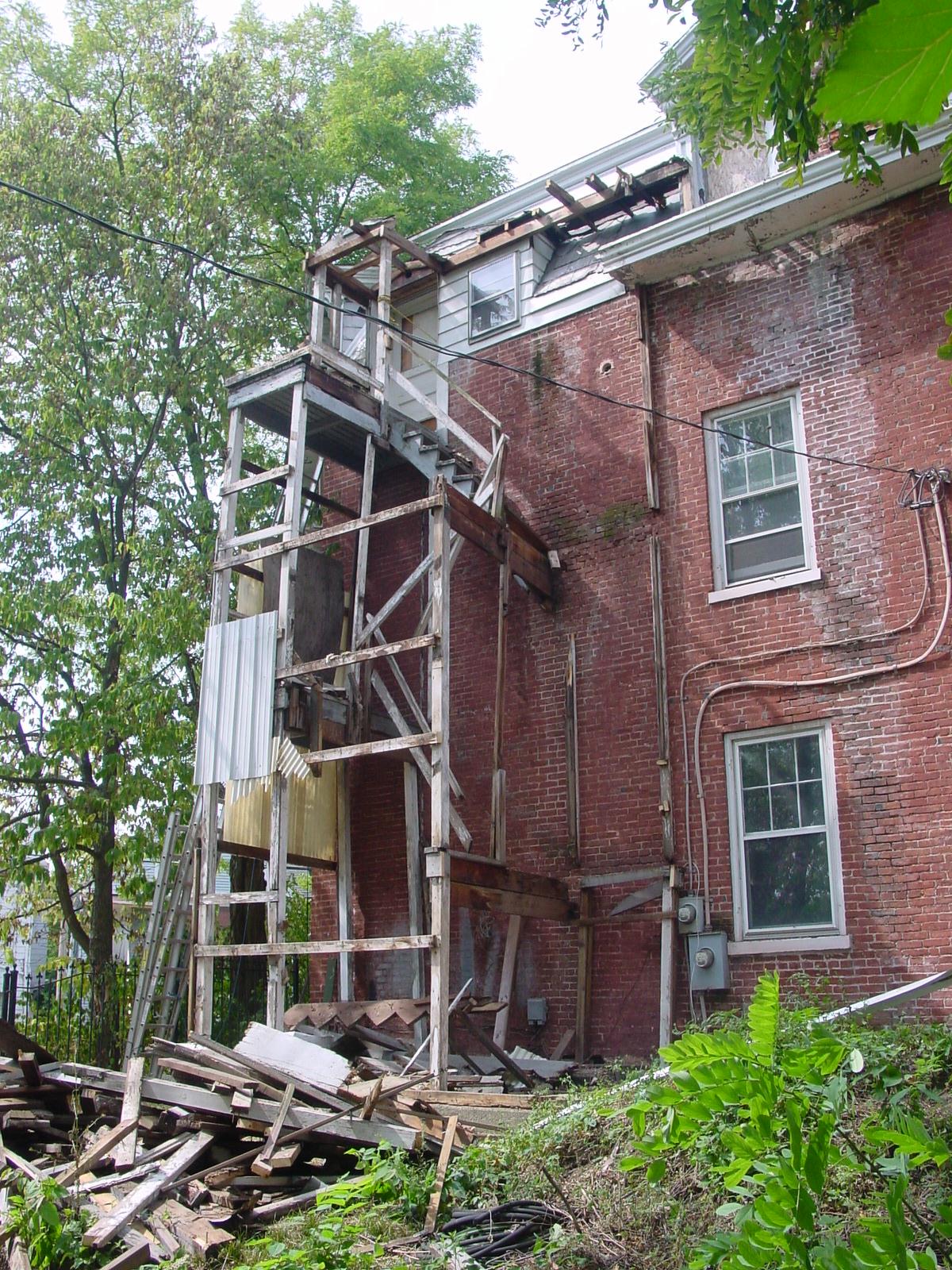 The entire structure had moved about an inch away from the brick wall over night. I wouldn't walk out on that top platform today whereas yesterday I was standing on it cutting wood. My neighbor in position as far away as possible holding a rope to pull down the remaining structure.